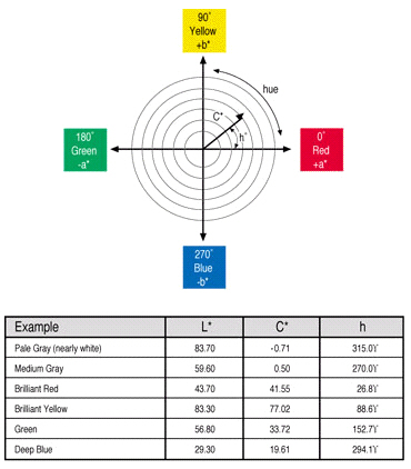 これは、CIELab表色系を基本として考え出された新しい表色計算方法です。 基本的にCIELab情報を使用しますが、通常のCIELab表色法より視覚的に理解しやすい彩度と色相を重要視してグラフィック情報を表します。 CIELchは、CIELabの直交座標をc(彩度)とh(色相)の極座標に変換します。 Lは同じで、明暗(明度)の座標です。