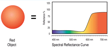 白色光が不透明な対象に当たると、対象は光に反応します。 対象が赤に見えるのは、対象が白色光の大部分を選択的に吸収し、赤い成分のみを反射しているためで、これが目には赤く見えます。