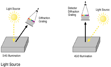 0/45°几何分光分度计在90°方向上照亮样品,检测器在45°方向上观测样品,而45/0分光光度计则是在45°方向上照亮样品,在90°方向上检测。很多色彩技术专家报告称,通过0/45°或45/0°几何光度计和色度计得到的数据与目测检测的经验非常近似。这一点对于配色或对色彩样本进行评估非常有利。然而,这个几何方法的显著缺点就是它不能检测透明的和半透明的样本。